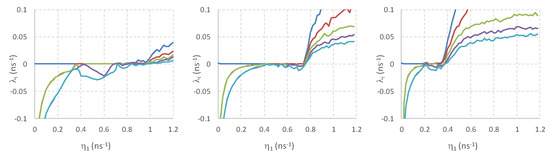 The five largest Lyapunov exponents: without FOF (i.e., η2 = 0 ns–1) (left), with FOF (i.e., η2 = 3 ns–1) (middle) and with large FOF strength (i.e., η2 = 8 ns–1) (right).