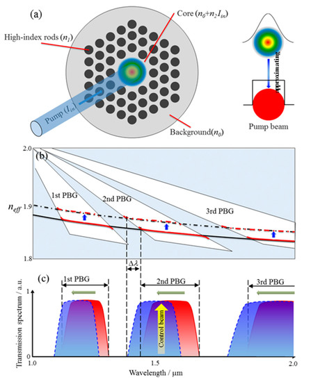 OKE refers to the phenomenon that the refractive index (n) of the fiber core depends on the intensity of the control pulse transmitting in it, which can be given by n = n0 + n2Iin. n0 is the linear refractive index of the core material, n2 is the nonlinear refractive index, and Iin is the intensity of the control pulse. Figure 1a shows the circumstance of a control pulse with intensity Iin transmitting in the core of an all-solid PBGF, in which the refractive index of the background and the high-index rods is n0 and n1, respectively. Although the control pulse intensity is in Gauss distribution, to facilitate the calculation, we suppose the control pulse is in Square distribution, thus the refractive index of the fiber core is n0 + n2Iin.