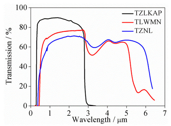 Generally speaking, with the same fiber parameters, the double-clad structure has stronger ability in light confinement than the single-clad structure. Therefore, the all-solid double-clad tellurite PBGF was designed and fabricated to carry out the relevant analysis and experiment. It was fabricated by the stack-and-draw technique based on 65TeO2-8Li2O-17WO3-3MoO3-7Nb2O5 (TLWMN, high-index rods), 70TeO2-15ZnO-5Na2O-10La2O3 (TZNL, background) and 17TeO2-16ZnO-15Li2O-10K2O-2Al2O3-40P2O5 (TZLKAP, cladding) glasses [27,28]. Table 1 shows the linear reflective indices (n0) and softening temperatures of the three glasses (T0), which were measured by the prisms method and a thermal expansion analyzer (TMA8310), respectively. The softening temperatures were similar but the linear reflective indices were different. The transmission spectrum was measured as shown in Figure 2. All three glasses exhibited excellent transmission property in the mid-infrared region.