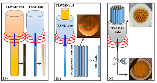 Fabrication process of the all-solid double-clad tellurite PBGF. (a) TLWMN and TZNL capillary. (b) Capillary with TLWMN core. (c) Fabricated the optical fibers.