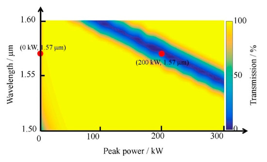 To investigate the ultrafast all-optical signal modulation in the all-solid double-clad tellurite PBGF, we focused on PBG located at 1540–1810 nm because most of the commercial laser sources were limited in the visible and near-infrared region. Moreover, to obtain the optimized power of the control pulse, the transmission spectrum was numerically simulated with the control pulse power increasing from 0 to 300 kW, as shown in Figure 5. The yellow region was the transmission band, and the blue region was the transmission forbidden band. In the region of 1.50 μm to 1.60 μm, the narrow transmission forbidden band shifted to the short wavelength with the increase of the power. Based on this simulation and our current experimental condition, a signal of 1.57 μm and a control pulse of 200 kW and 200 fs with the center wavelength of 1700 nm were selected for investigating the ultrafast all-optical signal modulation.