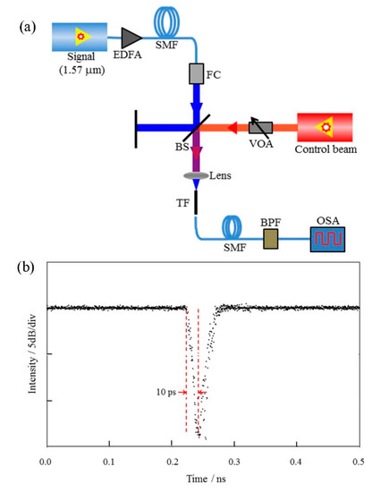 The experiment for investigating the ultrafast all-optical signal modulation was carried out in the 10 cm all-solid double-clad tellurite PBGF, as shown in Figure 7a. A tunable continuous-wave laser (Agilent, Santa Clara, CA, USA, 81600B-200) with a center wavelength of 1.57 μm was used as the signal source, and a high power Erbium-doped fiber amplifier (EDFA, FITEL, ErFA11501, Japan) further boosted the signal to ~200 mW. A SMF was connected to a fiber collimation (FC) with a focus length of 11.29 mm and a numerical aperture (NA) of 0.24 (Thorlabs, Newton, NJ, USA, F220FC-1550). The control beam is the pulse with a duration of 200 fs (full-width at half-maximum, FWHM), and a variable optical attenuator (VOA) was used to control its intensity. A beam splitter (BS, Thorlabs, BSW23) divided the signal into two beams, one of which was coupled into the fiber core by a CaF2 lens (Edmund Optics, Barrington, NJ, USA, DCX 25.4 X) together with the control pulse reflected by BS. The output pulse from TF was collected by a SMF and a tunable bandpass filter (BPF, Koshin Kogaku, Kanagawa, Japan, TFM-1550-S-SS) was used to separate the modulated signal from the control pulse. The signal was detected by an optical signal analyzer (OSA, Agilent Technologies, DCA-X 86,100 D, response time 10 ps) which can record the ultrafast signal. The center wavelength of the control pulse should locate inside the PBG region. The ultrafast single pulse has a high intensity of 200 kW and a duration of 200 fs.
