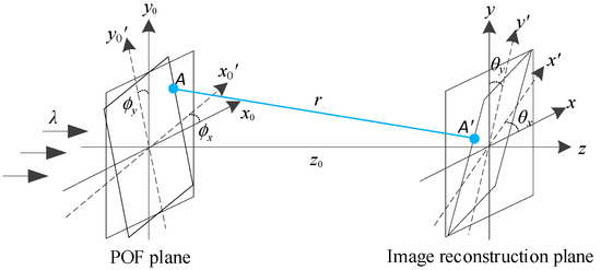 Figure 1 shows the generalized optical diffraction architecture when using a POF for single image reconstruction. (x0,y0) and (x,y) denote the original coordinates of the input POF and the output image reconstruction planes, respectively; z0 is the distance between the two origins at the two planes; and (x′, y′) denote the coordinates of the rotated POF and image reconstruction planes, respectively. The rotation angles of the tilted POF and image reconstruction planes are denoted as (x, y) and (θx, θy), respectively.