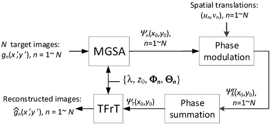 Figure 2 shows a flowchart of the generalized optical image multiplexing method. Given N target images, {gn, n = 1, …, N}, and their corresponding rotation angles, and , then , , , and denote the angles of the rotation about the , and axes, respectively, for the nth image at the reconstruction plane. The POF, , for each image can be retrieved by using the modified GSA (MGSA) [29] with the given parameters, including the distance z0, wavelength λ, and rotation angles {} in the TFrTs. For multiplexing purposes, each POF is multiplied by a phase term, in which the corresponding spatial translation is then defined. Next, all the POFs are summed and denoted as , which is the POCGH, and can be displayed in a phase-only device. To correctly reconstruct a specific target image, gn, the corresponding angle parameters {} should be provided in the TFrT. Various parameter combinations can be adopted in the MGSA for multiplexing and encryption purposes.