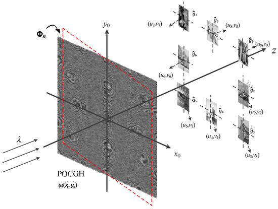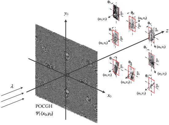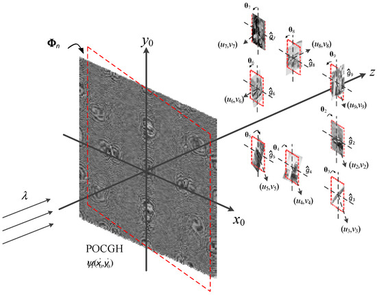 Figure 5 shows the second type of angle manipulation in which the various rotations with respect to the different images are adapted at only the POCGH plane. Here, all the rotation angles at the reconstruction plane are zero. The eight target images are translated to the different locations. A specific target image gn can only be reconstructed at its predefined position when the POCGH plane corresponds with the rotation angle . Otherwise, no images can be reconstructed, and only the noise-like pattern results can be detected on the plane. Note that the distance from the rotated POCGH to the reconstruction plane can be determined by using Equation (14) shown below: