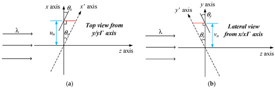 If we treat the rotation based on an axis as the coordinate transformation, the rotation order about the two axes is critical. That is, the combinational rotation matrices are different when using the different rotation orders on the Euler angles. In our case, we consider both the rotations about the “original” x- and y-directions. That is, the second rotation is not based on the first rotated axes. Therefore, the rotation effects about the two axes are independent and can be additive. In our rotation manipulation shown in Figure 1, the matrices denoting the rotations tilted about the original x′ and y′ directions can be expressed, respectively, as and . In addition, it is easy to prove that