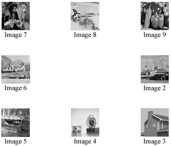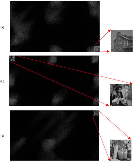In Figure 2, the POF of each target image is retrieved by using the MGSA based on the TFrT. For multiplexing, as seen in Figure 3, Figure 5 and Figure 6, the POF size is the same as the POCGH, and thus, each image must be placed into the center of an extended image plane of the same size. The remaining part of the plane is then filled using a zero padding scheme. Then, using the phase modulation and summation processes for the POFs of eight target images, we finally obtain the POCGHs for the three types of angle manipulation. A specific image at the corresponding location can be reconstructed only when the correct parameters in the TFrT are used. For example, Figure 8a–c shows that we have successfully reconstructed the “House,” “Indian,” and “Peppers” images at the corresponding locations at the reconstruction planes with the correct rotation angles and in their corresponding optical architectures, respectively. Only one image result is shown, as the others can be also reconstructed in all three optical architectures with their corresponding angles. Note that we applied Gaussian filtering to each reconstructed image to improve the quality.