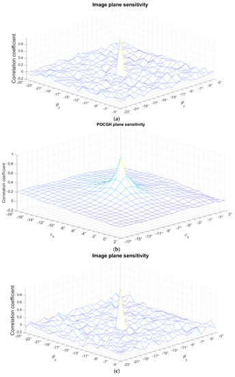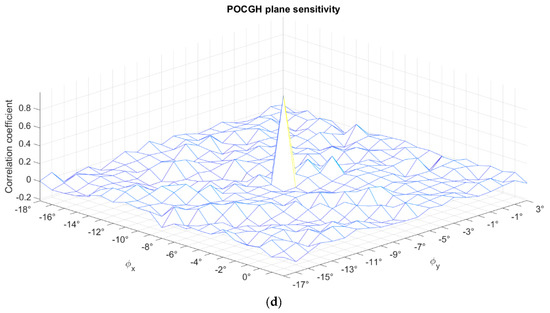 Next, we undertake an investigation into the angle sensitivity in the computer simulations. Figure 9a–d show the CC values of the reconstructed “Peppers” image when the rotation angles are maximally shifting 10° (with a step size 1°) from their correct values. Consider the first optical architecture shown in Figure 3. Figure 9a shows the CC values decrease very quickly, which represents a high sensitivity in this type of angle manipulation. Figure 9b shows the CC values when considering the same angle shifting at the POCGH plane in the second architecture. The CC value decreases more slowly than in Figure 9a. That is, the sensitivity is lower in this type of angle manipulation. Figure 9c,d show the CC values when the angle shift only occurs at the POCGH and image reconstruction planes, respectively, in the third optical architecture shown in Figure 6. Except for the center peak CC values, the other CC values are all lower than 0.2 in Figure 9c,d. Therefore, the angle sensitivity in these two planes is high enough in the third type of angle manipulation.