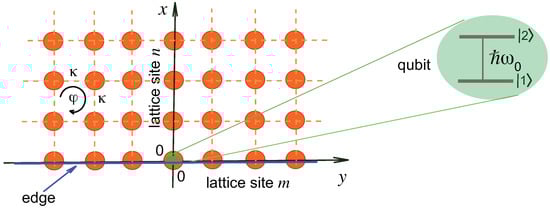 We consider a semi-infinite two-dimensional square array of coupled optical resonators and a qubit, such as a two-level atom, embedded in a boundary resonator of the array, as schematically shown in Figure 1. A synthetic gauge field is applied to the square lattice resonator so as to introduce Peierls phases and a non-vanishing effective magnetic flux in each plaquette of the array, thus realizing a photonic quantum-Hall topological insulator with chiral edge modes. The artificial gauge field can be accomplished, for instance, by dynamic modulation, using auxiliary cavities, or by other means, as discussed and demonstrated in several recent works [37,51,52,53,54,55,56,57,58,59,60]. We also mention that different types of reconfigurable two-dimensional photonic lattice configurations, with controllable switching between topologically trivial and non-trivial phases, have been suggested and demonstrated in several other different photonic setups [61,62,63,64,65,66].