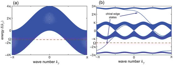 showing a single band of width as the wave number varies from to (Figure 2a). By varying the phase the energy spectrum shows a fractal structure, known as the Hofstadter butterfly [70]. For , the model explicitly breaks time-reversal symmetry because of the Peierls phase factors, which leads to the appearance of topologically non-trivial energy bands, i.e., bands characterized by a non-vanishing Chern number [25]. For rational values of , the band (15) splits into q magnetic sub bands with a wide family of topologically-protected quantum Hall chiral edge states [25]. For example, for and , the energy band (15) splits into four magnetic sub bands, with two wide gaps sustaining topologically-protected chiral edge states propagating in opposite directions, as shown in Figure 2b.