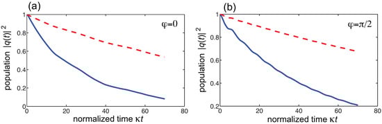is the frequency detuning between the resonance frequency of the two-level atom and the reference frequency of the optical mode of the resonators in the array. Clearly, is the probability that the two-level system remains in the excited state at time t. More generally, if at initial time the qubit is in a mixed state described by the density matrix () and the photon field in the resonator lattice is in the vacuum state, the reduced density matrix of the qubit at time t, obtained after tracing out the lattice degrees of freedom, reads