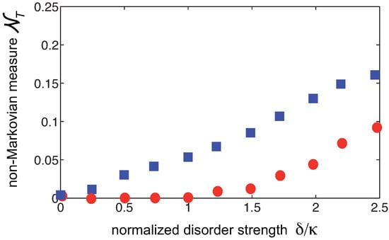 As the disorder strength is increased to values larger than , the quantum Hall bath becomes an Anderson insulator and chiral edge states are destroyed, i.e., all states become localized [43,44]. Hence, in the strong disorder regime we do not expect a substantial different dynamical behavior, in terms of quantum decay and non-Markovianity, between the and magnetic fluxes. This is confirmed by numerical simulations, as shown in Figure 5 and Figure 6. Figure 5 shows a few examples of decay dynamics and statistical distribution of the non-Markovianity quantifier , over 1000 realizations of disorder, for a disorder strength increased to . Note that in this case strong non-Markovian features are clearly visible both for and , i.e., topological protection of Markovianity in the case is not anymore observed. Figure 6 shows the numerically-computed behavior of the mean-value of the non-Markovianity quantifier versus disorder strength , clearly showing the disappearance of topological protection of Markovianity as the disorder strength is increased above .