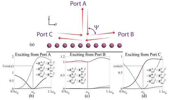(a) Schematic of a nonreciprocal metagrating (side view). Amplitudes of the reflected wave into different Floquet channels when exciting from (b) Port A, (c) Port B, and (d) Port C. For this specific design, we assume and .
