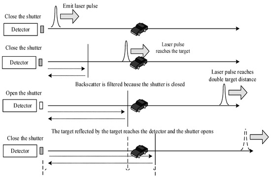 The principle of gated imaging is shown in Figure 2 [7,8]. The laser emits a pulse at time T. At this time, the detector shutter is closed. After a period of time , the target reflectance light reaches the detector. At this time, the detector shutter is opened by the high-precision synchronization control module, the target at a distance of can be imaged, where is the speed of light in a vacuum. After receiving the pulsed light, the shutter closes again and waits for the next pulse to come, and then cycle the imaging. It can be seen from the imaging principle that gated imaging only images the interested area and can artificially shield out irrelevant information. It is not only widely used in the detection of hidden target detection and underwater target detection, but also has important applications in rain, snow and foggy weather imaging.