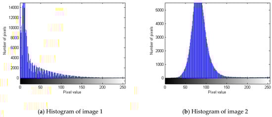 From Figure 5, we can know that the biggest difference between the images is brightness and contrast, but brightness and contrast cannot essentially classify images. In image enhancement, the overall distribution of image pixels is generally described with a histogram distribution [13]. A histogram is a table that represents the number of pixels with a certain value in an image. Therefore, the histogram has 256 abscissa values to represent the pixel values, and the vertical axis represent the distribution. The histogram of the statistical image is shown in Figure 6. Figure 6a is the histogram of Figure 5a. Figure 6b is the histogram of Figure 5b.