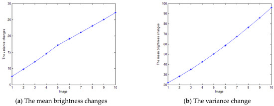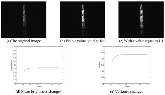 In order to find the relationship between imaging and homomorphic filter parameter c, different c values are used for processing. Let’s discuss night images first. Figure 8a is an image at night, while Figure 8b,c corresponds to the processing results of parameters c of 0.4 and 1.4, respectively. The homomorphic filtering parameter c increases from 0.4, with a step of 0.02 and a cycle step of 50 times, that is, the value of c changes from 0.4 to 1.4. The mean brightness and variance of the image processed after 50 cycles are shown in Figure 8d,e.