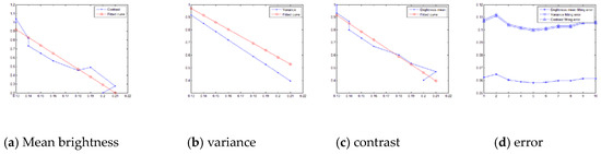 It can be seen from the Figure 10d that the closest fitting curve to the data is the mean brightness fitting curve, so y = −1073.1783x + 290.4094 (fitted curve of mean brightness) is selected as the equation to predict the best c value. So, when processing class II image, the following empirical formula is obtained as follows: