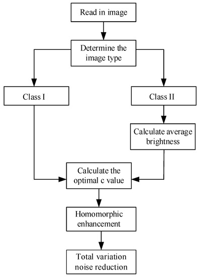 According to the description in Section 3 and Section 4, the flowchart of the adaptive algorithm is shown in Figure 11. Firstly, the type of image is determined. Whether the image is class I or II can be determined by the positive and negative quadratic terms of the fitted quadratic function. Then the optimal value of is determined for homomorphic filtering. In the homomorphic filter algorithm, the value of cut-off frequency is usually given a fixed value. In the formula of , we multiply and c into . The value of can also be changed by adjusting the value of c, thereby changing the filtering performance of the filter. Therefore, the adjustment of c indirectly changes the cut-off frequency. Finally, total variation noise reduction is performed.