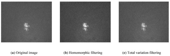 Various types of noise were finally introduced into the final imaging and manifested in three main forms of noise: impulse noise [1,2,3], Gaussian noise, and speckle noise [4,5]. Many scholars have performed in-depth studies on the problem of the restoration of images contaminated by noise, as in [1], where a weighted couple sparse representation model is presented to remove impulse noise. The dictionary is directly trained on the noisy raw data by addressing a weighted rank-one minimization problem, which can capture more features of the original data. In [2], a new TV-MCP model and its proximation method are proposed. The maximum SNR can reach two times that of the TVL1 method. In [3], a novel model that uses a devised cost function involving semi-supervised learning based on a large amount of corrupted image data with a few labeled training samples is proposed. In addition, speckle noise is one of the characteristics of laser image that is different from visible images. The previous literature is usually directed to a certain kind of noise. There are three kinds of noise in the laser image at the same time. It is difficult to determine which one has the greater impact. We must comprehensively consider the characteristics of each noise. A suitable filter must be selected to eliminate various noises according to the advantages and disadvantages of various types of filters. Most of the speckle noise in the laser image is concentrated in the low-frequency region, hence the homomorphic filtering is selected to suppress the low-frequency part. After high pass filtering, the low-frequency part is reduced and the high-frequency part is enhanced, so as to remove the speckle noise and improve the contrast of the image; for impulse noise and Gaussian noise, image denoising method with total variation minimization is used, and the edge features of the image are preserved to the maximum during noise reduction. The process of the proposed algorithm is as follows: firstly, the image is homomorphically filtered, the image contrast is improved, the speckle noise of the laser image is removed, and then a total variation minimization model is adopted to remove Gaussian noise and impulse noise of the laser image. In the selection of homomorphic filtering parameters, the c value has a great influence for different images. In general, the laser should irradiate the target, and the target itself corresponds to the pixel with larger brightness. During night imaging, the brightness of the background around the target is very small and the distribution of brightness value is relatively concentrated. In the daytime imaging, the background has miscellaneous flash due to the influence of sunlight, and the brightness value distribution is relatively uniform. The images obtained in this paper are divided into two types, one is the image with a concentrated distribution of brightness value, and the other is the image with a relatively uniform distribution of brightness value. For different image types, the size of the c value is adaptively selected.