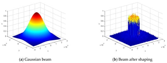 In addition, the Gaussian beam can be shaped into a laser beam with uniform distribution by AO system. Generally, the output beam of laser is approximately Gaussian distribution in spatial morphology, which is called Gaussian beam, as shown in Figure 17a. For laser imaging, we hope that the output light of laser is uniform, so that the light irradiated to the target is also uniform, which is conducive to improving the imaging quality, As shown in Figure 17b. The AO system modulates the complex amplitude distribution of the incident light field by controlling the deformed mirror and compensates the aberration of the system by changing the surface shape to achieve beam shaping. It has the characteristics of flexible control, good adaptability, high efficiency of light energy transmission and high damage threshold.