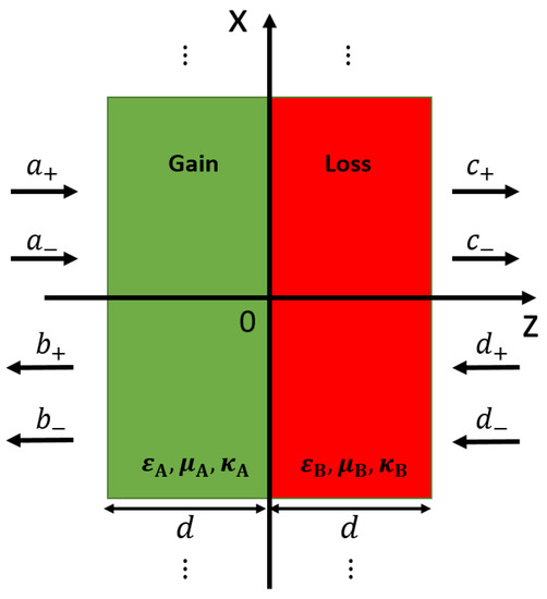 Having derived the necessary conditions for PT-symmetry in chiral systems (Equation (3)), in the rest of the paper we turn our attention to scattering configurations, applying those conditions and investigating the scattering features and response of the resulting systems. Our model-system is a homogeneous one-dimensional (1D) chiral bilayer (of thickness along z and infinite extent along the directions), as shown in Figure 1. The complex material parameters , , and of the two media involved in our system are the relative permittivity, relative permeability, and chirality parameter, respectively.