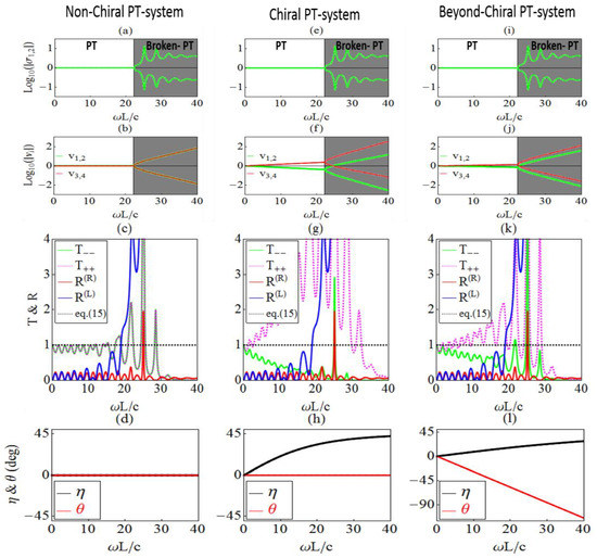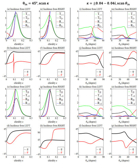 Regarding the transmission and reflection coefficients for our isotropic chiral medium, as expected and do not depend on the side of incidence (since the system is reciprocal), while a similar condition does not hold for the reflection coefficients, as can be seen in Figure 2g. Comparing Figure 2g with Figure 2c,k (i.e., the case of non-chiral PT-symmetric structure and the case beyond PT-symmetry in κ, respectively), we can see that the chirality parameter has strong influence on the transmission coefficient and none on the reflection. Note that the chirality independence of the reflection coefficient was also observed in the corresponding analytical expressions (even for non-PT systems; see Section 2), while from the same expressions (see Equations (12)–(21) and the paragraph after them) one can conclude that the transmission (power) coefficient depends on the chirality parameter exponentially (in particular T depends on the Im(κA+κΒ); see Figure 1). Such a dependence, although having strong influence on the transmission magnitude, does not affect the frequency position of the zeros and the resonances of the transmission, something observable also from Figure 2.