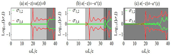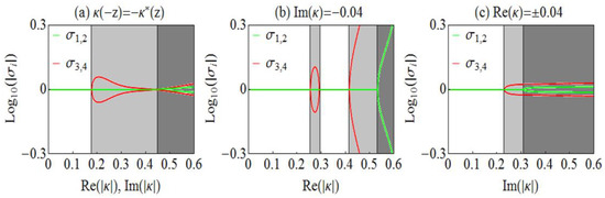 To analyze further the impact of chirality on the different PT–related phases of a chiral bilayer, we investigate the different PT-related phases for a system with permittivities and permeabilities, as in Figure 3, by scanning the PT-obeying chirality parameter (both real and imaginary part) at a fixed frequency, and incidence angle . The results for the eigenvalues of the scattering matrix as a function of chirality are illustrated in Figure 4a. In Figure 4a we can see that, as we increase the chirality, the system passes from PT-symmetric phase to mixed PT-symmetric phase (light grey) and, with further increase of the chirality, to PT-broken phase, indicating a possibility of a full control of exceptional points (EPs) and the associated PΤ phases by changing the chirality. Surprisingly, it is possible to achieve analogous control by changing only the real or only the imaginary part of the chirality, as illustrated in Figure 4b,c, respectively. All of the above reveal a very rich behavior and possibility for different phases and phase re-entries as one changes the system chirality.