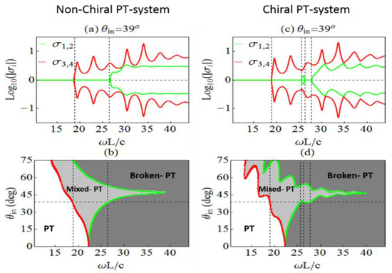 PT-symmetric system, as the one of Figure 1 (of length ), without chirality (left column) and with chirality (right column), with permittivity and permeability as in Figure 2. (a,c): Eigenvalues (σ) of the scattering matrix at incidence angle , as a function of the dimensionless frequency ωL/c, with c being the vacuum speed of light. (b,d): Phase diagrams showing the different attainable phases for different incidence angles. Red and green lines indicate the positions of the exceptional points. The horizontal dashed lines in (b,d) indicate the incidence angle considered in plots (a,c), respectively, and their crossings with the vertical dashed lines correspond with the exceptional points of (a,c).