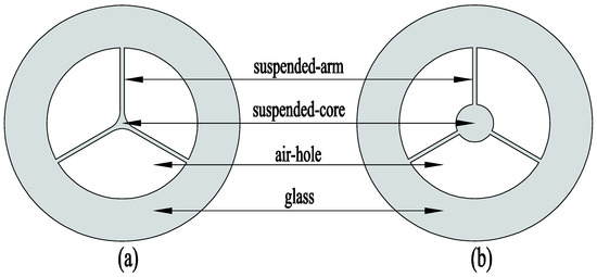 Two different types of suspended-core fibers (SCFs). (a) SCF with non-independent core (b) SCF with non-independent core.