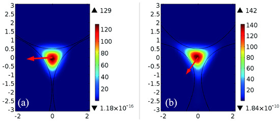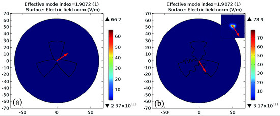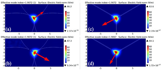 With the decrease in a, the opening of the air-hole becomes larger, the thickness of the suspension arm becomes thinner and the area of the suspension core decreases, facilitating the binding of the FM in the core. Figure 3a shows the FM field distribution of the structure (d = 3 μm, a = 0.10 μm−1) at 0.6 μm wavelength. The LP01 mode with two vertical degenerate modules, indicated with the red arrows in Figure 3b,c is confined tightly in the suspension core demonstrated by the simulation using the commercial software COMSOL.