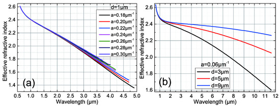 Figure 6a shows the neff curves as a function of the wavelength at d = 1 μm. It can be observed from the figure that the effect of a on the neff is not particularly apparent, and we found that the function change of the neff at d = 3, 5 and 9 μm is basically consistent with the law at d = 1 μm; therefore, the introduction of similar data is omitted. We observe that all curves decrease monotonically with the increasing wavelengths, as the fiber structure effectively limits the FM to the suspended core. As shown in Figure 6b, when the value of a is fixed, the neff of the fiber decreases with the increase of d. Further, this law intensifies with increasing wavelength.