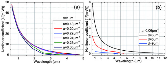Figure 7 shows that the nonlinear coefficient of the SCF has a significant inverse proportional relationship with the wavelength. Although the nonlinear coefficient decreases with increasing a, this effect is almost negligible compared to its variation with d. When λ = 0.6 μm, the maximum nonlinear coefficient can reach 49.26965 m−1W−1 at d = 1 μm, which is more than 70 times of that at d = 9 μm. Hence, to obtain a higher nonlinear coefficient, the core should be reduced to the greatest possible degree, which renders the preparation of the SCF more difficult. However, the large loss coefficient of the fiber cannot be ignored due to the limited mode field diameter. Therefore, the operating wavelength should also be considered as another important factor that significantly affects the nonlinear coefficient. From Equation (3) and Figure 7, we can clearly deduce that the operational wavelength is inversely proportional to the nonlinear coefficient. Notably, the absorption peaks of arsenic sulfide glass are mainly concentrated at ~3 μm (H2O) and ~4.3 μm (H-S) in the MIR. As there is no obvious absorption peak in the near-infrared region, the loss coefficient of As2S3 SCF is not excessively large. The blue-shift of the operating wavelength is another effective approach to improve the nonlinear coefficient.