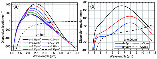 The dispersion of As2S3 block glass, as denoted by the black dotted line in Figure 8, is proportional to the wavelength, such that there is only one ZDP of ~4.9 μm. It was found that almost all the SCFs designed in this study exhibit dual-ZDW when d ≤ 9 μm. Their first ZDPs are more concentrated, whereas the second ZDPs are more dispersed. Table 2 indicates that the standard deviation is very small, regardless of d. Therefore, parameter a has little influence on the first ZDPs.