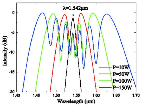 Subsequently, SC continues to be distorted under the influence of high-order dispersion and nonlinearity of the SCF. Figure 11c shows that when P = 20 kW, the higher-order soliton splits into four Raman solitons due to the anomalous dispersion region, and the pulse wavelength of the soliton becomes longer through the soliton self-frequency shift [39]. Moreover, Raman solitons and the dispersive waves emitted by them generate new frequency components through the cross-phase modulation (XPM) and FWM effect, which further broadens the SC.