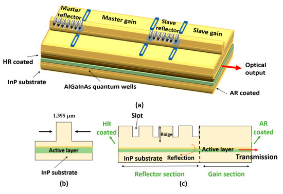 The schematic of the multi-section PIC is shown in Figure 1a. The device is fabricated using a standard 1550 nm laser material (InP). Five strained ((Al0.23Ga)0.3In0.7As) quantum wells of 5 nm thickness form the active region. This active region is placed on an n-doped InP substrate. There are in total 22 slots with a depth of 1.395 µm, as shown in Figure 1b, which represents the side view of the device. These slots are used to control the longitudinal spectrum. Standard electron beam lithography is used in the fabrication of the slots to provide precise control of the slots’ dimensions (width, depth) and location [16]. The total length of the device is ∼1.5 mm. The PIC consists of two regrowth-free Fabry-Pérot (FP) lasers, integrated into a master-slave configuration. Each laser consists of two electrically isolated sections, with different cavity lengths named gain and reflector sections, as shown in Figure 1c. The gain section of each laser is a FP structure that generates and amplifies the light inside the cavity. This gain section has an anti-reflection (AR)-coated facet. Each of the multiple reflector sections of the laser serves as a grating. The multiple uniformly distributed slots in the reflector section act as a filter that enhances various FP mode(s), but suppresses other modes of the FP resonance. Hence, it restricts the FP laser to a single mode of the allowed FP cavity modes. This results in achieving a single longitudinal mode emission [17]. These distributed slots can be considered as an active distributed Bragg grating [18]. The left facet at the end of the slots region (reflector section) is high-reflection (HR)-coated. Both reflector sections of the two lasers are etched into the surface ridge waveguide, close to the active region, to provide internal reflections and enable a high SMSR (~50 dB) [16]. Furthermore, they provide improved control of the emission wavelength and the injection power inside the PIC. Both sections of the laser (gain and reflector) share the same active layer and InP substrate. Besides consisting of two main sections, which are the master reflector (MR) and the master gain (MG), the master laser shares the slave reflector (SR) with the slave laser, which enables a reduction of the overall length of the device, providing better confinement and control of the total temperature of the PIC. The length of each section is optimized for its specific functions which enable the optimization of the PIC as a device for employment in short reach networks. The master gain is designed to be the longest of all sections (712 μm), in order to achieve a low linewidth emission. The slave gain section, on the other hand, is much shorter (355 μm), to ensure a high modulation bandwidth. The two reflector sections have an equal length of 215 μm. The isolation between different sections is achieved by separating them with a 2 μm wide etched trench, whose impedance is measured to be 2.29 kΩ.
