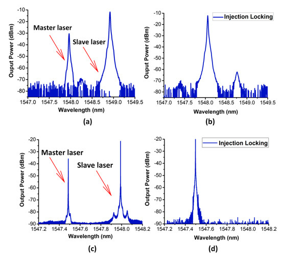 As the PIC consists of two distinct lasers, two independent spectral modes, corresponding to each laser, can be generated by the device. A continuous-wave (CW) spectrum of the master (biased at 35 mA) and slave (biased at 90 mA), operating in single-mode regime, is shown in Figure 2a (OSA resolution: 20 pm). Biasing the device at “bias point 1” listed in Table 1 results in achieving the injection locking spectrum shown in Figure 2b. To further confirm the independence of the two lasers, the two independent spectral modes are shown again in Figure 2c, where the OSA is set to a finer resolution of 0.04 pm. The master laser and slave lasers are biased at 40 and 60 mA, respectively. OIL is achieved again at “bias point 2” listed in Table 1 and its spectrum is shown in Figure 2d. It is important to note that OIL could be achieved at several other bias points, but we only highlight the two listed points for brevity.