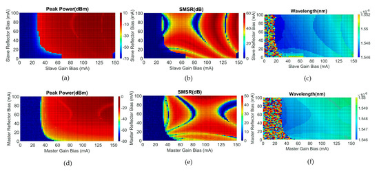 Figure 4a–c show the main mode peak power, SMSR, and main mode emission wavelength of the slave laser, as a function of the SG and SR bias currents, respectively. For this test, the master laser is turned off (MG and MR biased at 0 mA). Figure 4d–f show the same parameters for the master laser, as a function of MG and MR bias currents. Here, the slave laser is biased just above transparency (SG = 10 mA, SR = 5 mA) to minimize any interaction between master and slave lasers. The SG and MG sections biases are varied from 0 to 150 mA, while the SR and MR section biases are varied from 0 to 100 mA as per the safe operating conditions of the PIC. From Figure 4a, it can be observed that the SG has an average threshold of around 32 mA, when the SR is biased over 20 mA. This threshold value decreases with the increase of the SR bias. In addition, it can be noted that lasing from the SR section can be observed when the SG is at least biased at 30 mA and the SR is biased at least 65 mA. From Figure 4a,b, it can be seen that for single-mode operation (high SMSR > 40 dB), the peak power of the slave reaches a maximum of 9 dBm. The SMSR contour plot in Figure 4b allows one to identify the bias currents that result in a high SMSR (dark red regions) as well as the currents at which the device shows multi-mode behaviour (blue and cyan regions). The latter has been confirmed by observing a bi-modal operation of the slave laser on the OSA. A high SMSR of around 55~60 dB can be achieved for several bias points. Figure 4c shows the emission wavelength of the slave laser main mode. From the plot, it can be observed that by varying the currents, the wavelength of the slave laser can be tuned gradually over ~2 nm, before a mode hop occurs (marked by an abrupt change in colour). The multi-coloured region on the left of the plot corresponds to the noise in the OSA, since for those currents the laser is biased below the threshold. The gradual variation in the emission wavelength (between the mode hops) is caused by temperature changes due to the Joule effect [19] occurring with the increase in the bias of the SG and SR sections. When the temperature increases, the central emission wavelength of the laser experiences a redshift [20]. This dependence is more obvious for the SG section than for the SR, due to lack of a grating in the SG section.