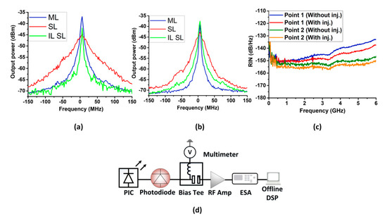 (a) Electrical spectra of the measured linewidth of master laser (ML), slave laser (SL) and injection-locked slave laser (IL SL) the master laser for bias point 1 in Table 3; (b) same for bias point 2 in Table 3; (c) RIN values for bias points 1,2 in Table 4 with (red, orange) and without injection (blue, green) and (d) RIN measurement setup diagram.