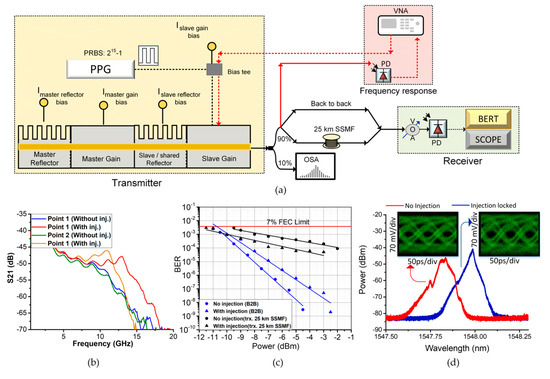 BER results as a function of the received optical power are presented in Figure 6c. The measurements are taken for both the cases when the master laser was turned off (circles) and on (triangles). For the B2B transmission, the injected case has a power penalty of 2 dB with respect to the non-injected one at BER . This penalty can be attributed to the fact that the optical injection reduces the threshold current of a laser, resulting in a degraded extinction ratio [35]. However, after transmission over 25 km of SSMF, the optically injected laser performs significantly better. The received optical power required to achieve the FEC limit for the injection case is 2 dB lower than that without injection. This can be attributed to a reduction of the chirp due to the applied OIL [36]. For both cases, a BER below the hard decision (7% overhead) forward error correction (FEC) limit (BER ) is achieved. The optical spectra recorded using a 0.04 pm resolution OSA (APEX AP2433B) in Figure 6d further verify the reduction in frequency chirp, where the OIL case is represented by the blue line and the non-injected case by the red line. It can be seen that the spectral width of the modulated laser without OIL is significantly broader than when the master laser is turned on. The interplay between the fiber chromatic dispersion and this large spectral width (due to higher value of chirp) causes pulse spreading, leading to intersymbol interference and resulting in a degraded performance (worse BER). The insets in Figure 6d show the recorded eye diagrams at a received optical power of 0.5 dBm for both cases. The reduced eye-opening for the laser without injection is visible and validates the results of the BER measurements.
