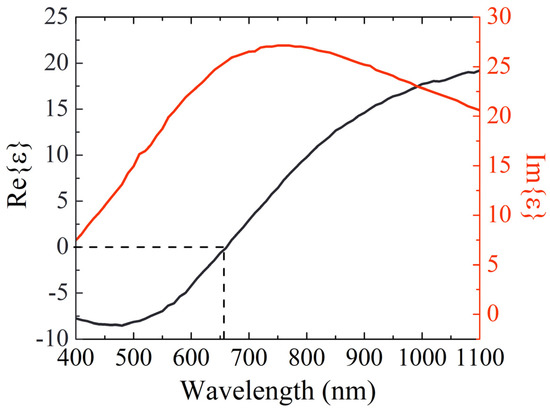 Real (black line) and imaginary (red line) parts of the permittivity of the Bi1.5Sb0.5Te1.8Se1.2 (BSTS) film. The real part of the permittivity is close to zero at a wavelength of 670 nm.