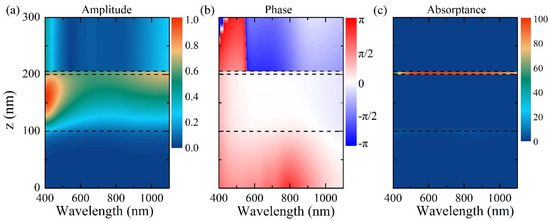 Distributions of the (a) electric field amplitude, (b) phase, and (c) absorptance as a function of the wavelength for the ZIM structure. The dashed lines are plotted to indicate the interface between different materials. Here, tBSTS = 5 nm and tSiO2 = 100 nm.