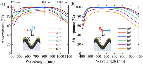 Due to the resonant effect, the optical response of the nanostructure is generally dependent on the angle of the incident light. Therefore, the performance of resonance-based perfect absorbers gets degraded as the incident angle increases, in particular for oblique angle incidences. To further investigate the performance, the absorption spectra of the optimized ZIM structure are also calculated as the incident angle increases from 0° to 60° under both transverse-magnetic (TM) and transverse-electric (TE) polarizations, as shown in Figure 5. For planar-type structures, the designed absorber is polarization-insensitive at a normal incidence, whereas for oblique incidence, the TM and TE polarizations exhibit different absorption behaviors. As shown in Figure 5a, a high and plateau absorption band remains as the incident angle approaches 50° under TM-polarized illumination. For larger incident angles, the obvious absorptance degradation occurs at a long wavelength side.