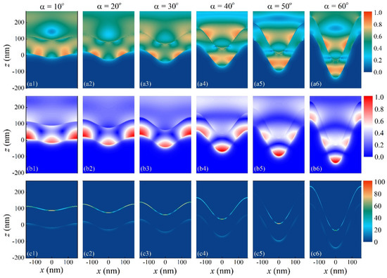 Calculated distributions of the normalized electric field (a1–a6), normalized magnetic field (b1–b6), and absorption (c1–c6) at 428 nm as the geometry angle α increases from 10° to 60° under the illumination of TM-polarized light propagating along the z-axis. Here, tBSTS = 5 nm and tSiO2 = 100 nm.