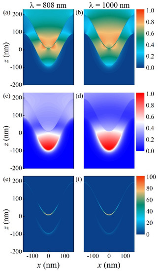 Calculated distributions of the normalized electric field (a,b), normalized magnetic field (c,d), and absorption (e,f) at wavelengths of 808 and 1000 nm when the geometry angle α is 50° under the illumination of TM-polarized light propagating along the z-axis. Here, tBSTS = 5 nm and tSiO2 = 100 nm.