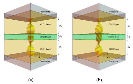 Figure 1 presents two configurations of the structure of the modeled optical system, i.e., CLC cell with a defect layer (DL) inside, and sandwiched between two (lower and upper substrates) homogenous isotropic media. Figure 1a presents the nondeformed director field, whereas Figure 1b shows the deformed director field caused by the applied electric field. The studied system is located in the right-handed Cartesian coordinate system, where the z-axis was chosen to be the twist axis of the CLC.