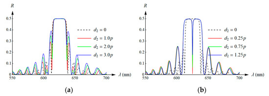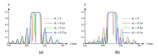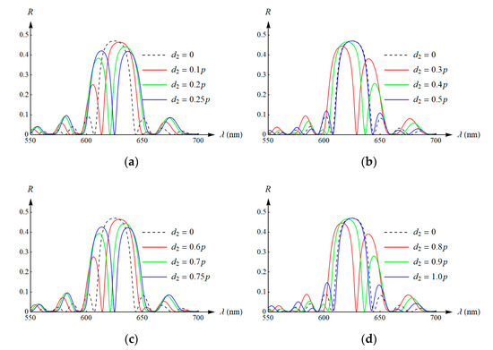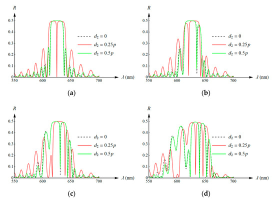 The regularities in spectra presented in Figure 2 are easy to understand. When the thickness of the defect increased, the characteristic peak of the maximum value shifted toward the long-wave boundary of the bandwidth, while the second maximum appeared simultaneously on the left side of the spectral curve. For the layer thickness equal to 0.25 p (Figure 2a), the spectral curve had a form of two symmetrical maxima with a slightly smaller amplitude around the wavelength of the maximum reflection for the system without the defect. With a further increase in the thickness of the defect (see Figure 2b), a similar situation occurred, but on the other side of the band gap (i.e., mirror image in comparison to the results presented in Figure 2a). For d2 = 0.5 p, the obtained spectral curve was almost identical to the curve obtained for the system without the defect (only a very small narrowing of the selective reflection bandwidth was visible). Increasing the defect thickness from 0.5 p to p (see Figure 2c,d) caused a similar effect to changing the value of the d2 parameter in the range from 0 to 0.5 p (compare these curves with the curves presented in Figure 2a,b, respectively).