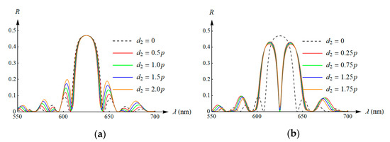 Figure 3a shows a comparison of curves obtained for the defect layer thickness of 0.5 p, p, 1.5 p, and 2 p, while Figure 3b shows the comparison for d2 = 0.25 p, 0.75 p, 1.25 p, and 1.75 p, respectively. In the first case (Figure 3a), we obtained similar results to for the system without the defect layer. The increase in the thickness of the defect layer (i.e., d2 equal to 0.5 p, p, 1.5 p, or 2 p) caused only a very small and gradual narrowing of the bandwidth and a significant increase in the amplitude of the side peaks. In turn, for the value of the parameter d2 tested in Figure 3b (i.e., d2 equal to 0.25 p, 0.75 p, 1.25 p, and 1.75 p), two symmetrical peaks were obtained with a slightly smaller amplitude and with a zero reflection coefficient for λ = (no + ne)·p/2 ≈ 625 nm. This gradual increase in the defect thickness resulted in a gradual but slight flattening of these spectral curves.