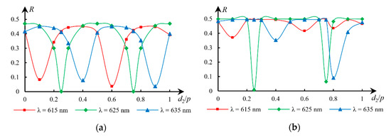 The simulation results presented in Figure 6 show that the reflection coefficient for individual wavelengths varied significantly depending on the thickness of the defect layer (in the range from 0 to 0.5), which was already observed in previous figures. Figure 6a shows that for the wavelength of 625 nm, the total reflection occurred for d2 = 0, 0.5 p and p, while no reflection occurred for d2 = 0.25 p and 0.75 p. Similar changes occurred for other wavelengths, i.e., 615 and 635 nm, with their maximum and minimum values occurring for other thicknesses of the defect layer. More interesting results are presented in Figure 6b. They were obtained for a greater total thickness of the investigated optical system. In addition, in this case, for the wavelength 625 nm and d2 = 0.25 p, there was practically complete quenching of the selective reflection. However, for d2 = 0.75 p, the value of the reflection coefficient no longer reached zero. This effect, also for larger values of the d2 parameter (i.e., d2 = 1.25 p), is clearly visible in Figure 5b. As the value of the thickness d2 increased, the values of the reflection coefficient for λ = 615 and λ = 635 nm also increased. As a result, it can be stated that for the thicker tested optical system and thicker defect layers, the selective reflection bandwidth was significantly broadened without an undesired decrease in its amplitude.