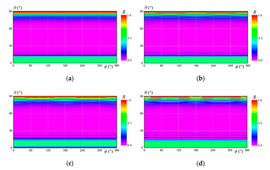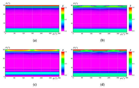 We also calculated the reflectance distribution (color plots) for the oblique incident light for all three cases (i.e., case A, case B, and case C). Color plots presenting these calculations in a graphical form are depicted in Figure 10. The presented results (here calculated for d2 = 0.1 p) confirmed the previous conclusions obtained on the basis of spectral curves and distributions of the reflection coefficient. Practically, no differences in the reflection spectra were observed for case B and case C, which is clearly shown in Figure 10d.