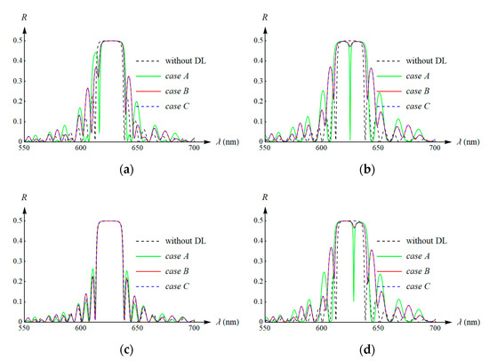 The above figures present the simulations obtained for symmetrical systems (d1 = d3). Here we also examined the influence of the location of the defect layer inside the investigated CLC cell. To do it, we compared previously tested model 2 (i.e., d1 = d3 = 20 p, further referred to as case A), with two examples of the asymmetrical location of the defect layer, namely d1 = 10 p, d3 = 30 p (further referred to as case B) and d1 = 30 p, d3 = 10 p (further referred as case C). Again, we considered the case of normal incidence of light first. For comparison, the presented figures also show the case where there was no defect layer (marked as “without DL”). The analysis of the results presented in Figure 9 leads to the conclusion that in asymmetrical systems (i.e., case B and case C), the spectral curves differed slightly from the curves obtained for the symmetrical system (case A). In addition, the influence of the defect location in the reflection spectra for case B and case C was practically unobservable. Namely, we did not find a significant difference in spectral characteristics between case B and case C.